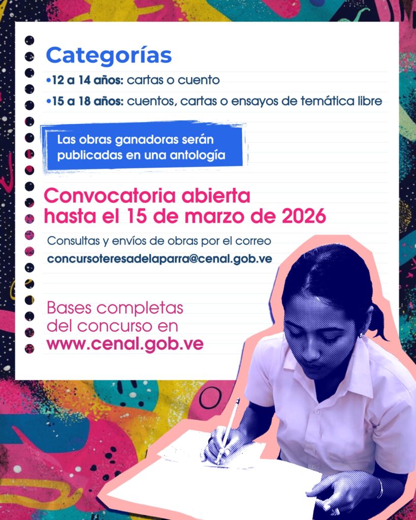 Para consultas y envío de las obras está disponible el correo electrónico: concursoteresadelaparra@cenal.gob.ve.